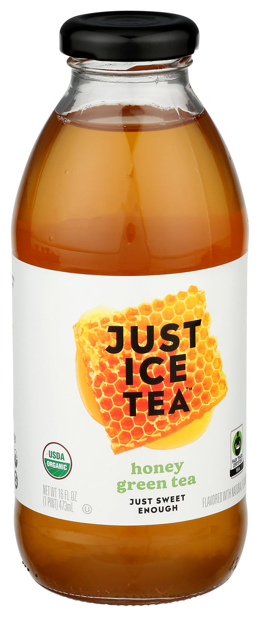 Just Ice Tea Honey Green Tea org 16 fl oz Caffeine: 50 mg per bottle about 1/3 the caffeine of a 16 oz brewed coffee. Contains real Honey....