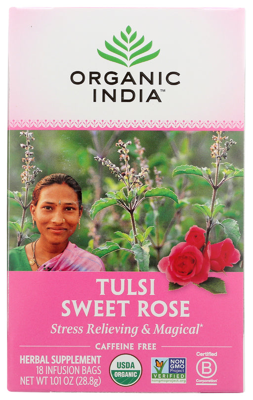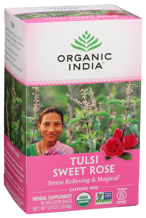 Organic India Tulsi Tea, Sweet Rose, 18 Bag Organic India Tulsi Tea, Sweet Rose is a delicate blend of tulsi finely balanced with soothing chamo...