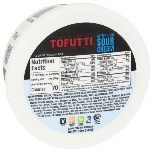 Tofutti Imitation Sour Cream, 12 Oz. Tofutti Imitation Sour Cream is a non-dairy sour cream alternative for use in cooking, baking, dips, dressi...