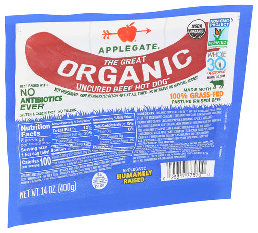 Applegate Organic Uncured Beef Hot Dogs, 10 Oz Applegate Organic Uncured Beef Hot Dogs are made with 100% certified regeneratively sourced beef....