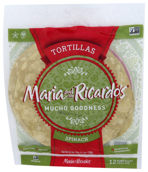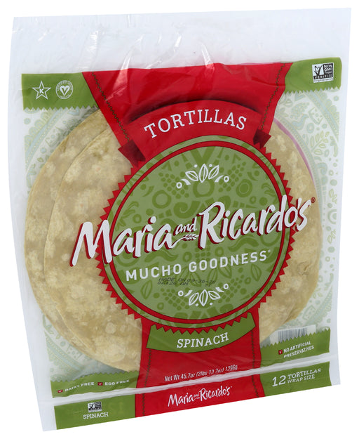 Maria And Ricardo's 12" Tortillas Spinach Flour, 45.7 oz Non GMO, kosher dairy, certified vegan.