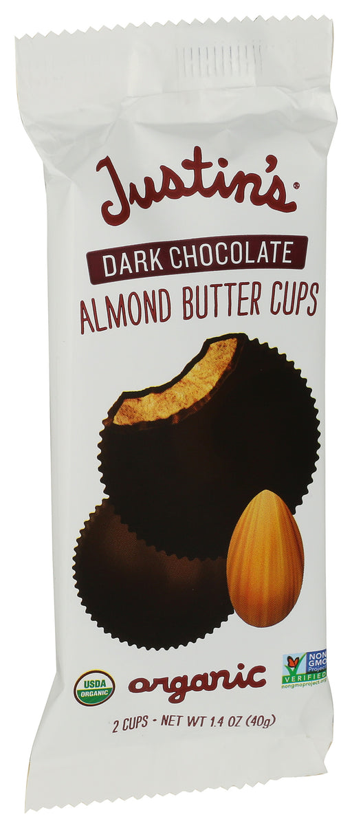 Justin's Almond Butter Cups Dark Chocolate 1.4 oz Orangutan friendly palm oil. Kosher, gluten free, non GMO, USDA organic, OTCO. Justin's...