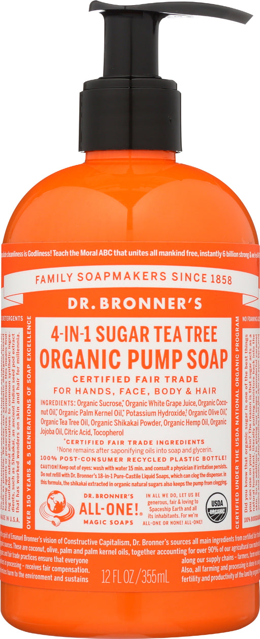 Dr. Bronner’s Tea Tree Sugar Hand Soap, 12 Fl. Oz. Dr. Bronner’s Tea Tree Sugar Hand Soap has ingredients good for body and earth. Organic fair ...