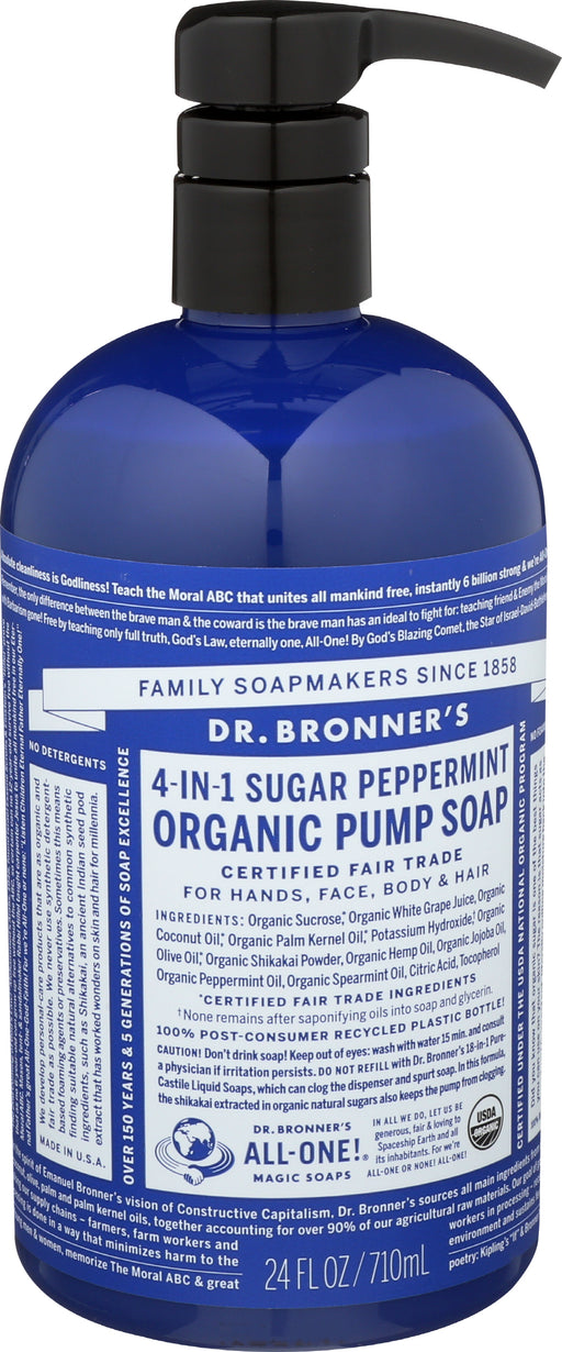 Dr. Bronner’s Organic Sugar Peppermint Soap, 24 Fl. Oz. Dr. Bronner’s Organic Sugar Peppermint Soa is for hands, body, hair and face. Organic bo...