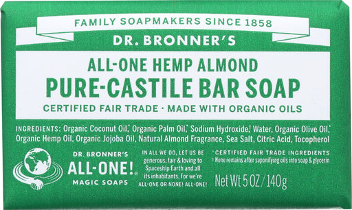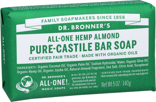 Dr. Bronner’s Pure-castile HEMP Almond Bar Soap, 5 Oz Dr. Bronner’s Pure-castile HEMP Almond Bar Soap is warm, comforting and slightly sweet lik...