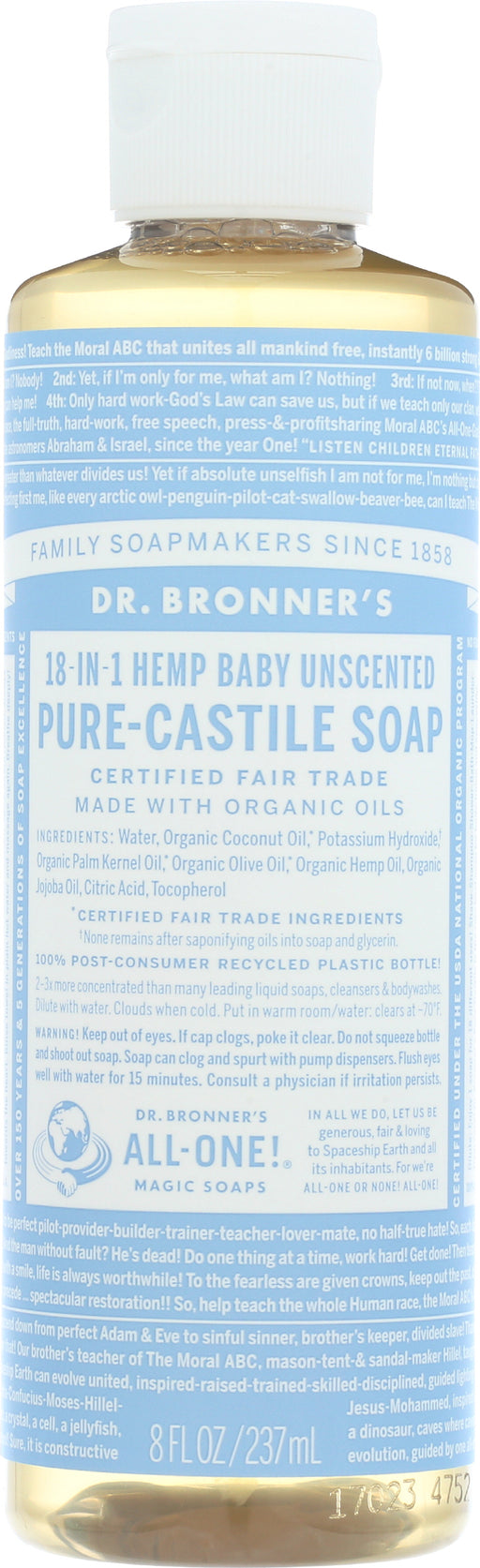 Dr. Bronner's Pure-castile Baby Unscented Soap, 8 Fl. Oz. Dr. Bronner's Pure-castile Baby Unscented Soap harnesses the power of organic ingredie...