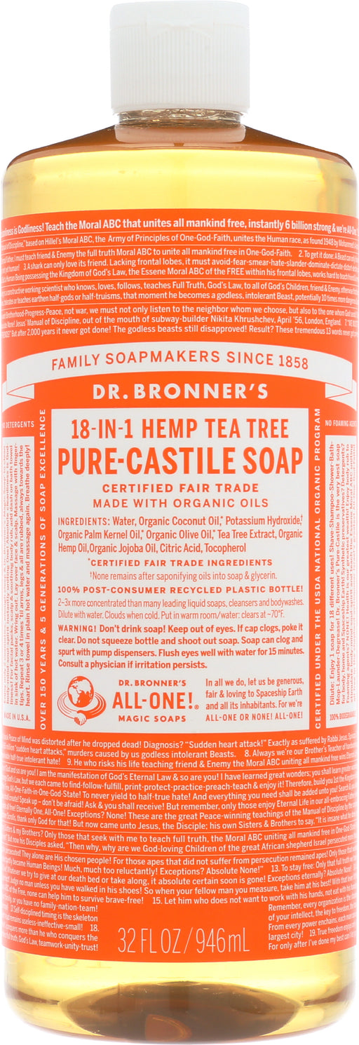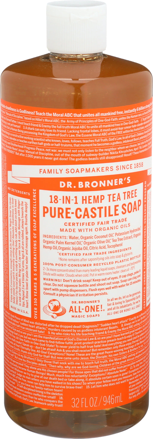 Dr. Bronner’s Pure-castile HEMP Tea Tree Soap, 32 Fl. Oz. Dr. Bronner’s Pure-castile HEMP Tea Tree Soap is woodsy and medicinal. It contains pur...