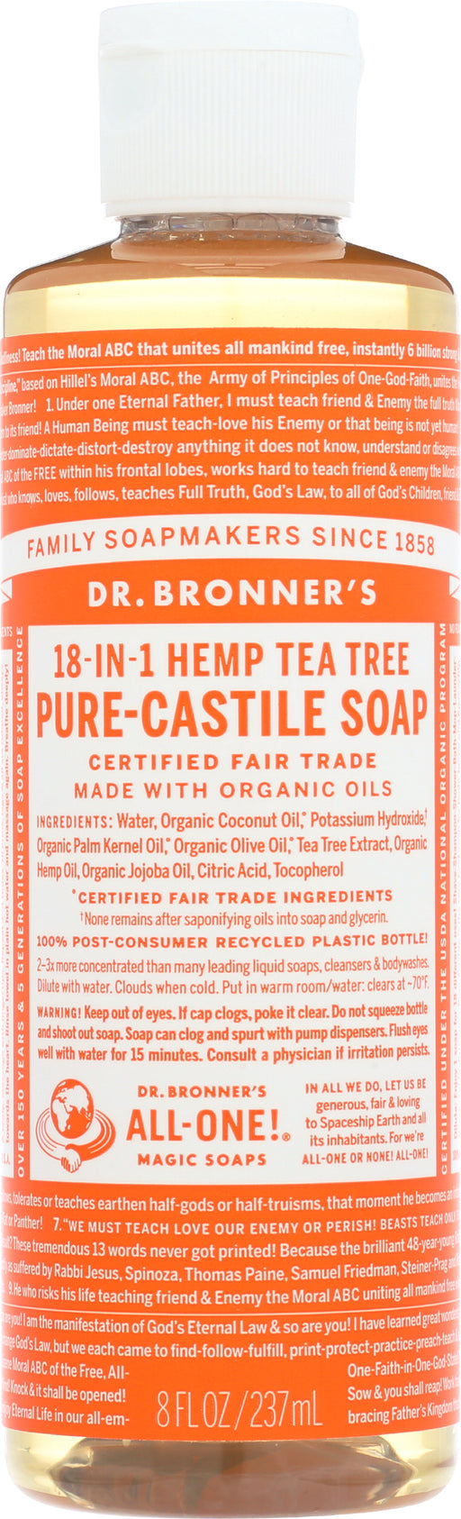 Dr. Bronner's 18-in-1 HEMP Tea Tree Pure-castile Soap, 8 Oz. Dr. Bronner's 18-in-1 HEMP Tea Tree Pure-castile Soap is a plant-based replacement ...