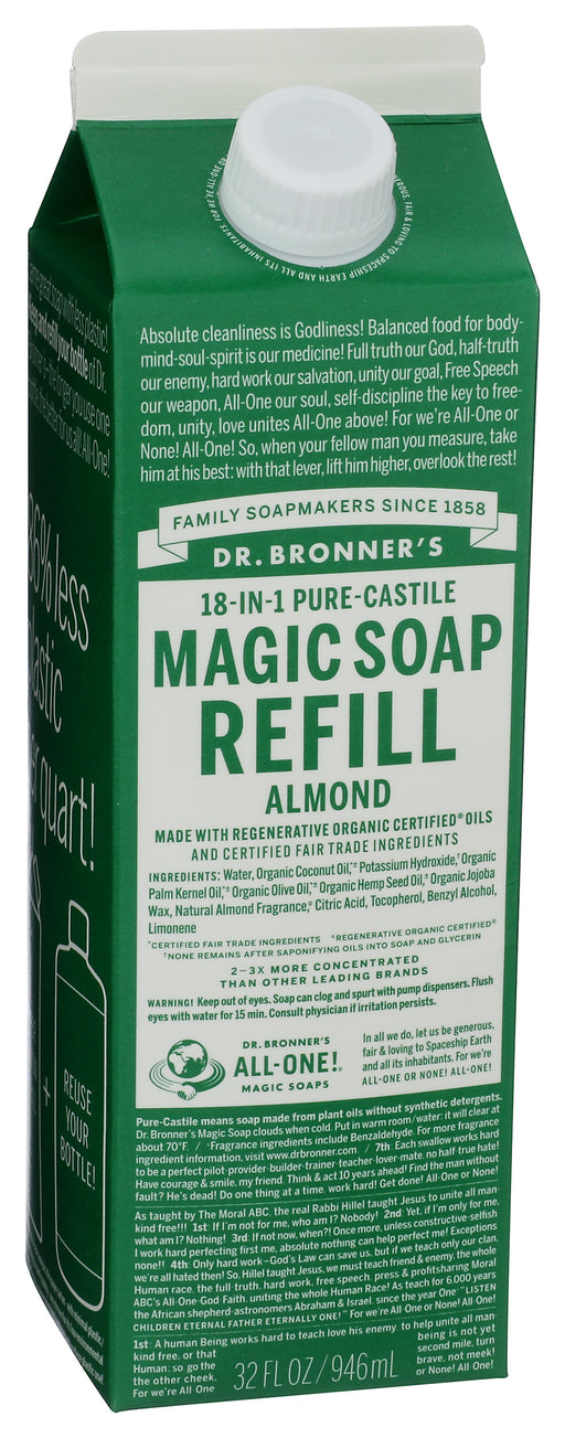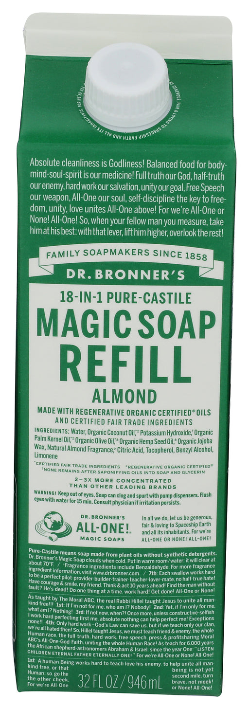 Dr. Bronner's Almond Pure-Castile Liquid Soap-Refill Carton, 32 Fluid Ounce Dr. Bronner's Almond Pure-Castile Liquid Soap-Refill Carton delivers...