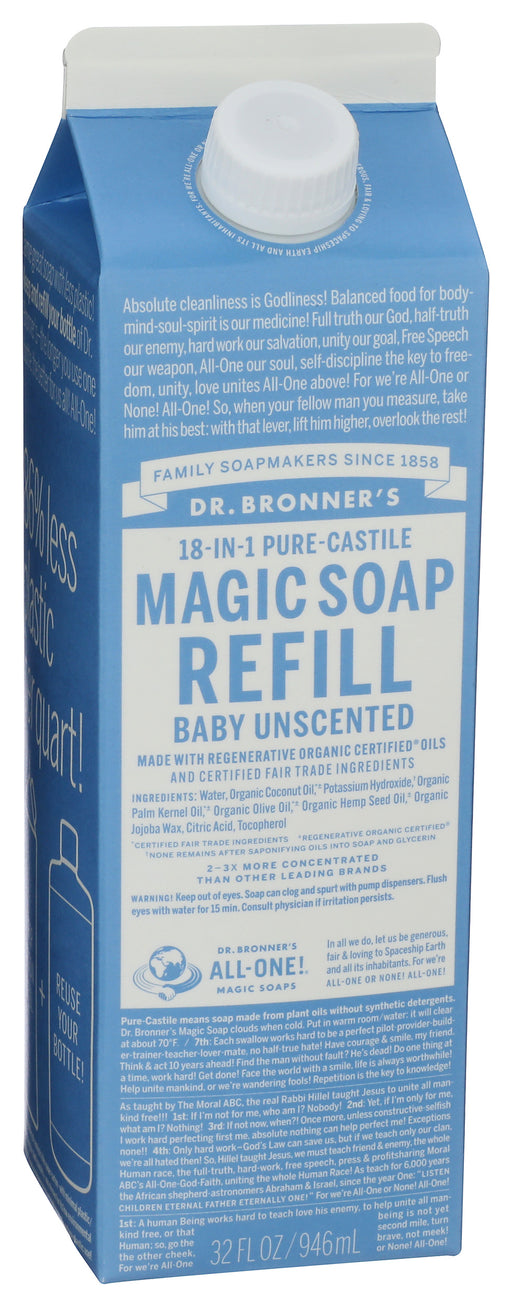 Dr. Bronner's Baby Unscented Pure-Castile Liquid Soap-Refill Carton, 32 Fluid Ounce Dr. Bronner’s Baby Unscented Liquid Soap is great for sensit...