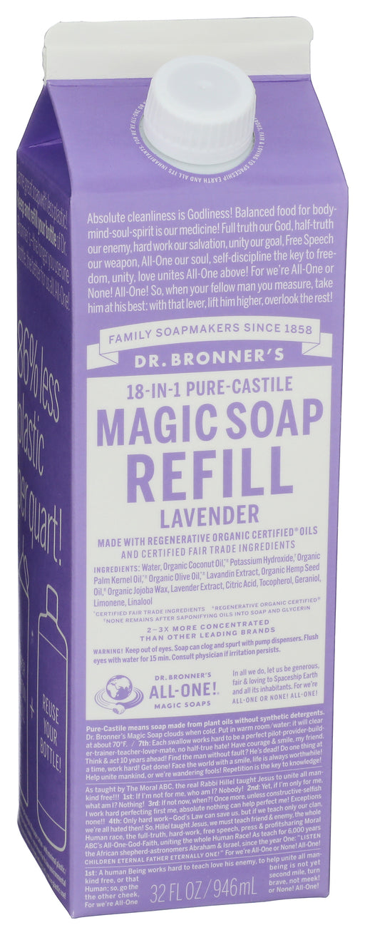 Dr. Bronner's Lavender Pure-Castile Soap Refill Carton, 32 Fluid Ounce Dr. Bronner’s Lavender Liquid Soap. Infused with pure French lavender ess...