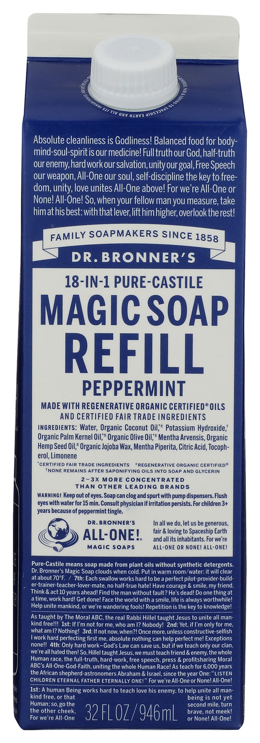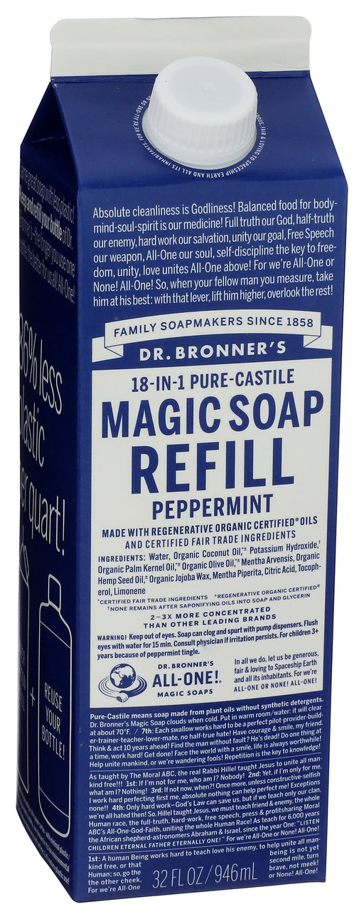 Dr. Bronner's Peppermint Pure-Castile Soap Refill Carton, 32 Fluid Ounce Dr. Bronner’s Peppermint Liquid Pure-Castile Soap Refill Carton Soap is...