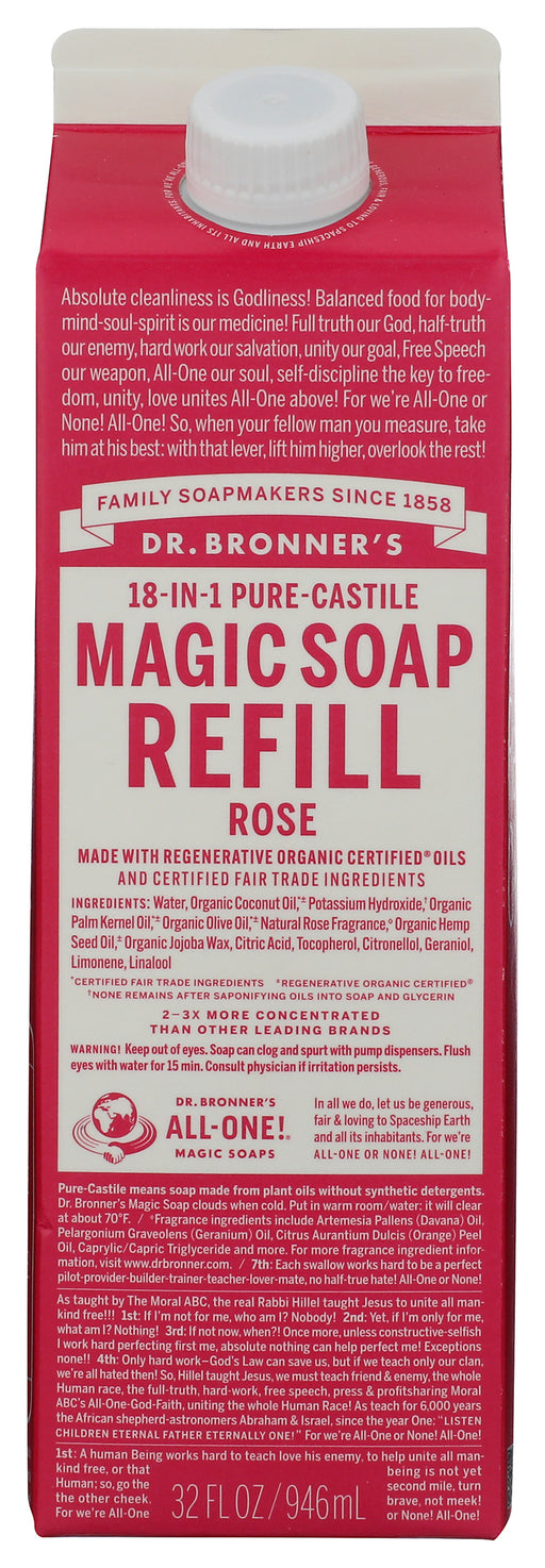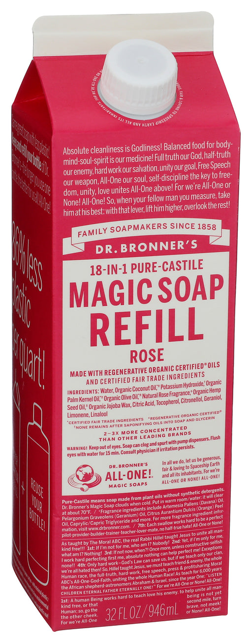 Dr. Bronner's Rose Pure-Castile Soap Refill Carton, 32 Fluid Ounce Dr. Bronner’s Rose Liquid Soap. This true soap is infused with a high concent...