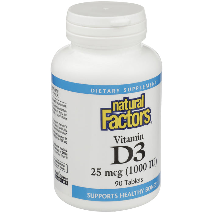 Natural Factors Vitamin D3 1000 Iu Dietary Supplement Tablets provide 250% of your daily dose of Vitamin D3 to help support healthy bones and increase calcium absorption. This bottle contains 90 tablets, and we recommend taking one per day or as directed by your doctor. Our Dietary Supplement Tablets contain no artificial colors, preservatives or sweeteners, and we test them via mass spectrometer for potency and purity. *