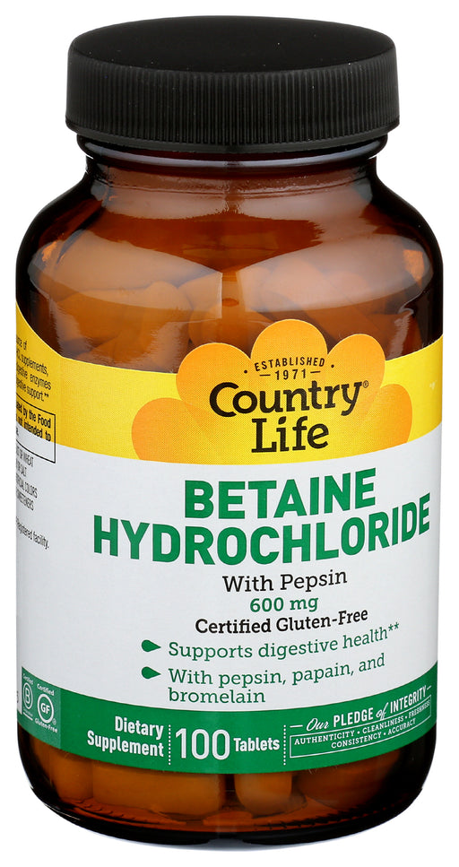 Country Life Betaine Hydrochloride With Pepsin 600 Mg., 100 Tablets Country Life Betaine Hydrochloride With Pepsin provides Hydrochloric acid an...