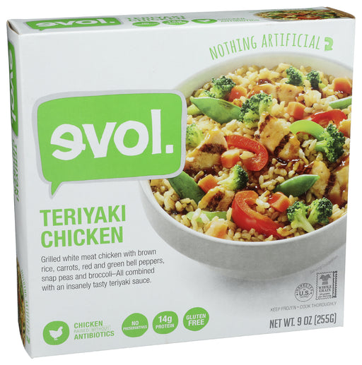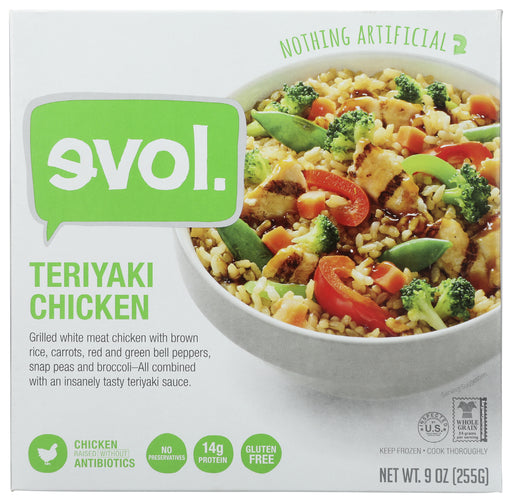Evol Entree Teriyaki Chicken, 9 oz Evol Entree Teriyaki Chicken is a grilled white meat chicken with brown rice, carrots, red and green bell pep...