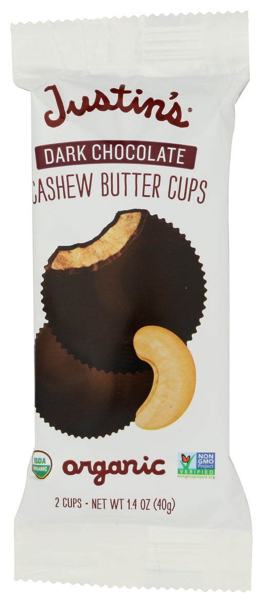 Justin's Cashew Butter Cups Dark Chocolate 1.4 oz Orangutan friendly palm oil. Kosher, gluten free, non GMO, USDA organic, OTCO. Pollina...