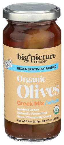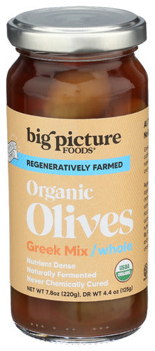 Big Picture Foods Regenerative Organic Greek Mix Whole Olives, 7.8 Ounce Big Picture Foods Regenerative Organic Greek Mix Whole Olives are all t...