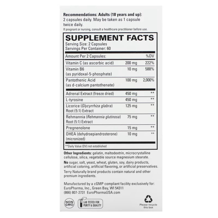 Terry Naturally Adrenaplex, Max Adrenal Support helps minimize nutrients lost by stress and supports healthy adrenal hormone balance for optimal physical and mental health. Bio-identical DHEA, a crucial hormone needed for a healthy response to occasional stress, plus supportive pregnenolone ( a building block for other necessary hormones ) and targeted adrenal extract for optimal glandular function. Vitamin C, vitamin B6 ( as P-5-P ), l-tyrosine, and pantothenic acid to support emotional well-being and mood, healthy energy metabolism, physical endurance, and resistance to the negative effects of stress. Powerful botanical ingredients licorice and rehmannia. Licorice prevents the breakdown of the key adrenal hormones needed during occasions of stress, making them more available to the body. Rehmannia root contains a compound called catalpol, which helps support healthy production of adrenal hormones. *