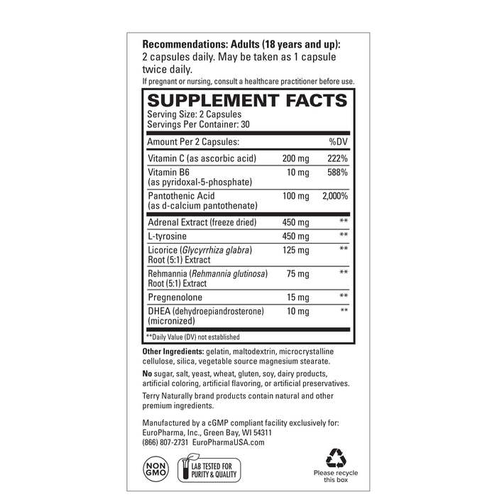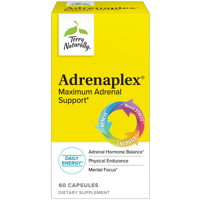 Terry Naturally Adrenaplex, Max Adrenal Support helps minimize nutrients lost by stress and supports healthy adrenal hormone balance for optimal physical and mental health.Adrenal extract, DHEA, L- tyrosine, pregnenolone. Bio-identical DHEA, a crucial hormone needed for a healthy response to occasional stress, plus supportive pregnenolone ( a building block for other necessary hormones ) and targeted adrenal extract for optimal glandular function. Vitamin C, vitamin B6 ( as P-5-P ), L-tyrosine, and pantothenic acid to support emotional well-being and mood, healthy energy metabolism, physical endurance, and resistance to the negative effects of stress. Powerful botanical ingredients licorice and rehmannia. Licorice prevents the breakdown of the key adrenal hormones needed during occasions of stress, making them more available to the body. Rehmannia root contains a compound called catalpol, which helps support healthy production of adrenal hormones. *