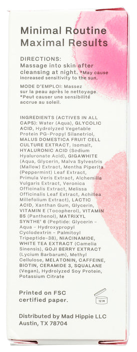 Mad Hippie Aha Exfoliating Peel is a peptide + alpha hydroxy acid based serum! Shed dull skin and discoloration to reveal brighter, smoother looking skin. Contains sixteen actives including alpha hydroxy acids, apple stem cells, and gigawhite. Apple stem cells, which come from the rare swiss apple tree, have powerful antioxidant and skin rejuvenating properties. Gigawhite, a natural blend of six organically grown alpine plants, brightens and smooths the complexion.