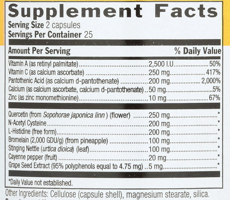Country Life Gluten-free Aller-max capsules combine quercetin, bromelain and vitamin C in a certified gluten-free formula to ease digestion. Adults take two capsules between meals for best results. This non-drowsy formula combines a non-citrus bioflavonoid from flower buds and the enzyme of the pineapple stem with vitamin c and the power of herbs like cayenne pepper and stinging nettle. This bottle contains 50 Aller-Max Capsules. *
