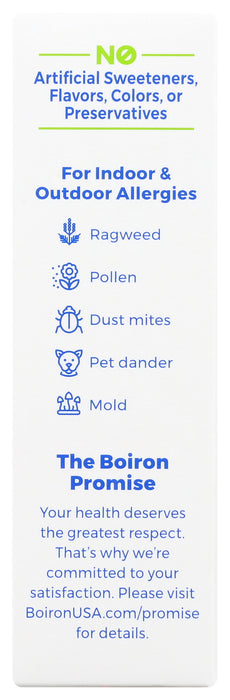 - For indoor & outdoor allergies ragweed pollen dust mites pet dander mold the Boiron promise your health deserves the greatest respect. That's why we're committed to your satisfaction.
