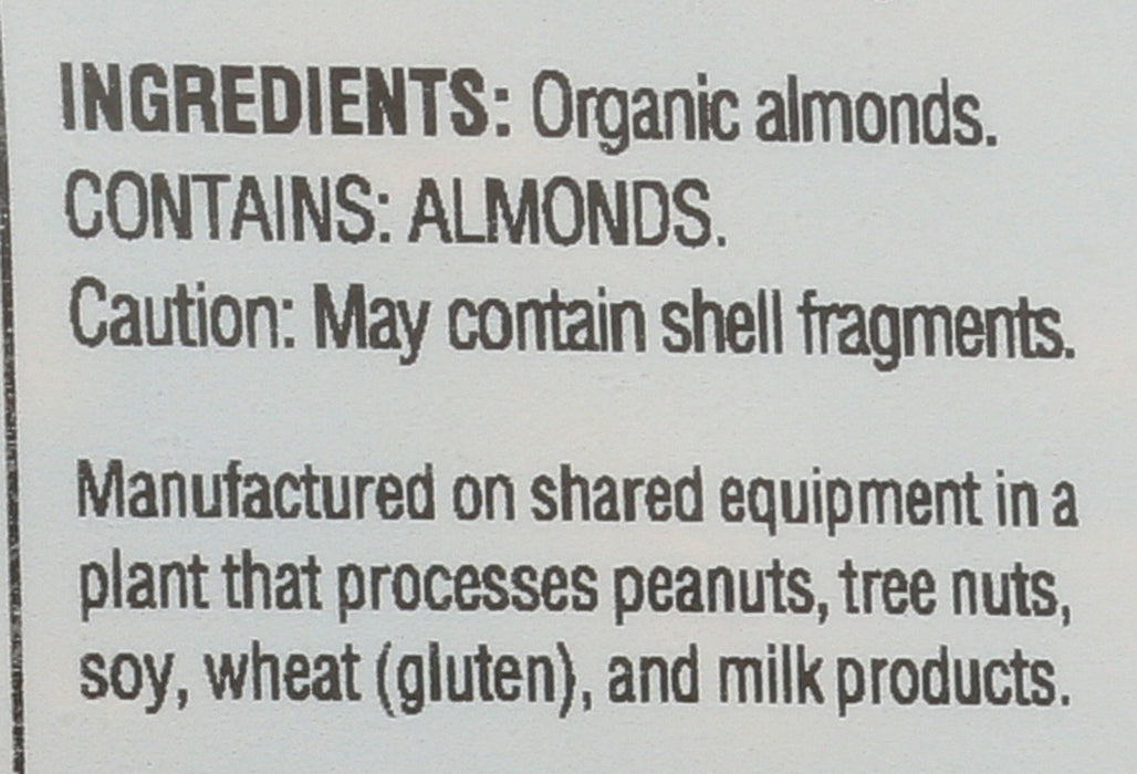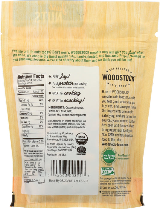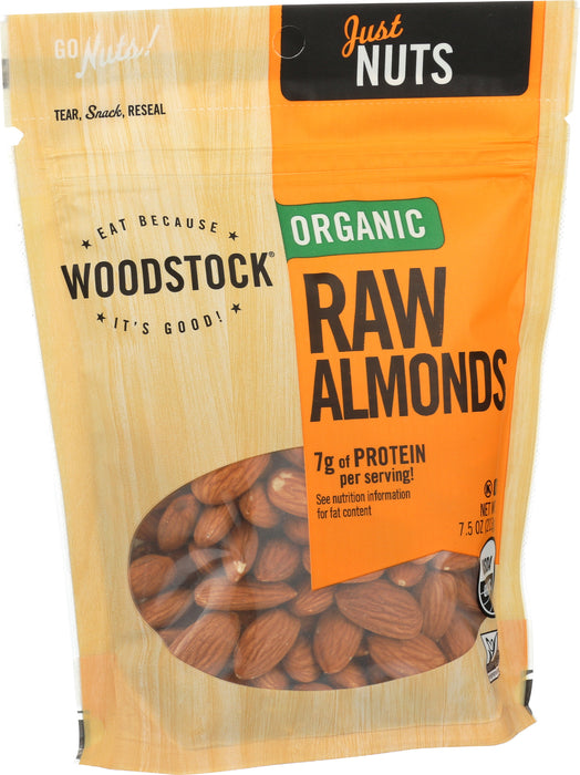 Woodstock Organic Almonds, Raw, come in a resealable 7.5 oz. bag full of nothing other than delicious, whole, organic almonds. with 7 g. of protein in each serving our nuts are a healthy and tasty snack. our Almonds are produced in the usa, usda organic certified and non-gmo project verified. see nutrition label for allergen information.