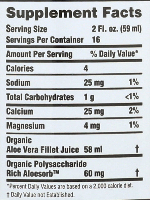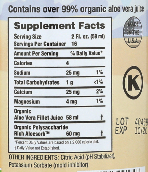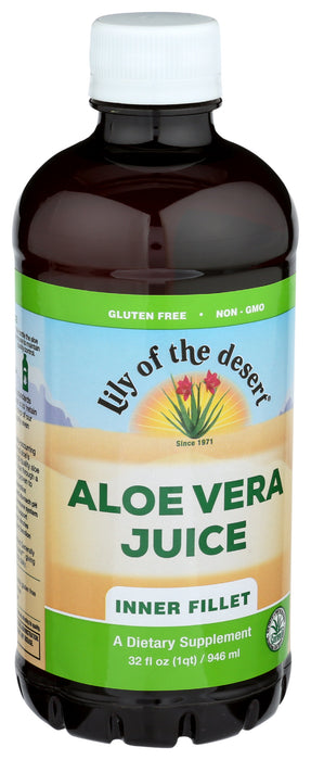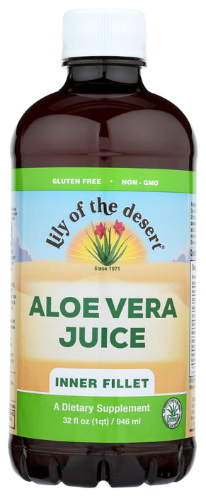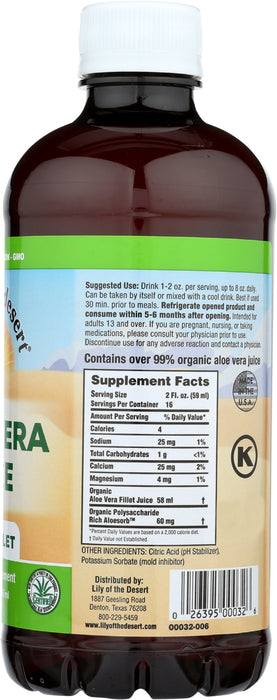 Lily of the Desert Aloe Vera Juice is made with all natural, organic ingredients including 99% Aloe Vera Juice rich with antioxidants. one 32 oz bottle of Lily of The Desert is a kosher dietary supplement with 25 mg of calcium per serving to help support a healthy immune system and digestive regularity.