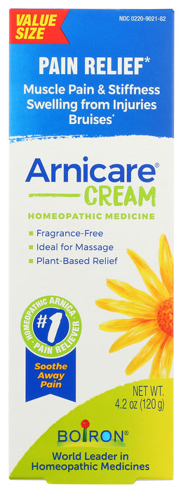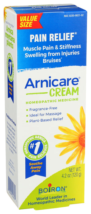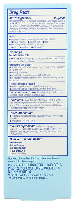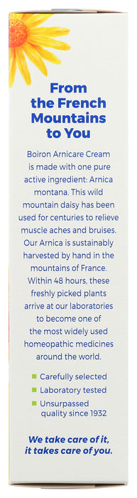 Boiron Arnicare Cream is a montana 1x hpus 7% relieves muscle pain, and stiffness, swelling from injuries, discoloration from bruising. This wild mountain daisy has been used for centuries to relieve muscle aches and bruises. Our arnica is sustainably harvested by hand in the mountains of france. Within 48 hours, there freshly picked plants arrive at our laboratories to become one of the most widely used homeopathic medicines around the world. *
