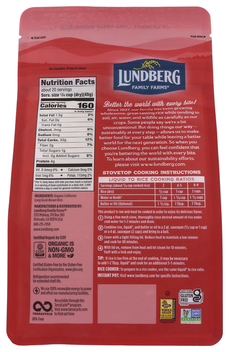 Lundberg Family Farms Organic California Brown Basmati Rice has always been a family favorite for its versatility and pleasant aroma. This long, thin grain is light and won't clump together when cooked, making it a natural fit for curry, stir-fry, salad, pilaf, and dessert recipes that call for distinct kernels with a fluffy texture. Grown with earth-preserving practices, our 20+ rice and quinoa varieties are cultivated to maximize the flavor of each tiny grain. Long, short, black, brown, white, red, and blended. Each variety brings something different to the table so you can get creative in the kitchen.