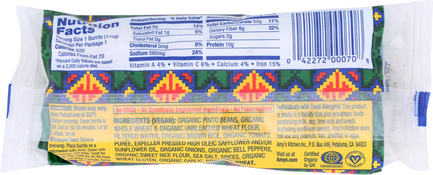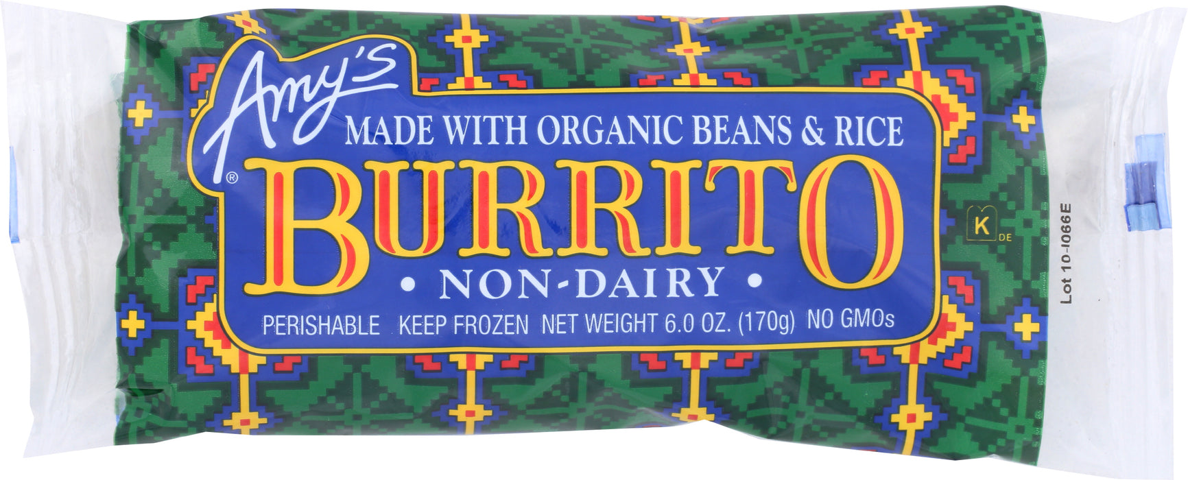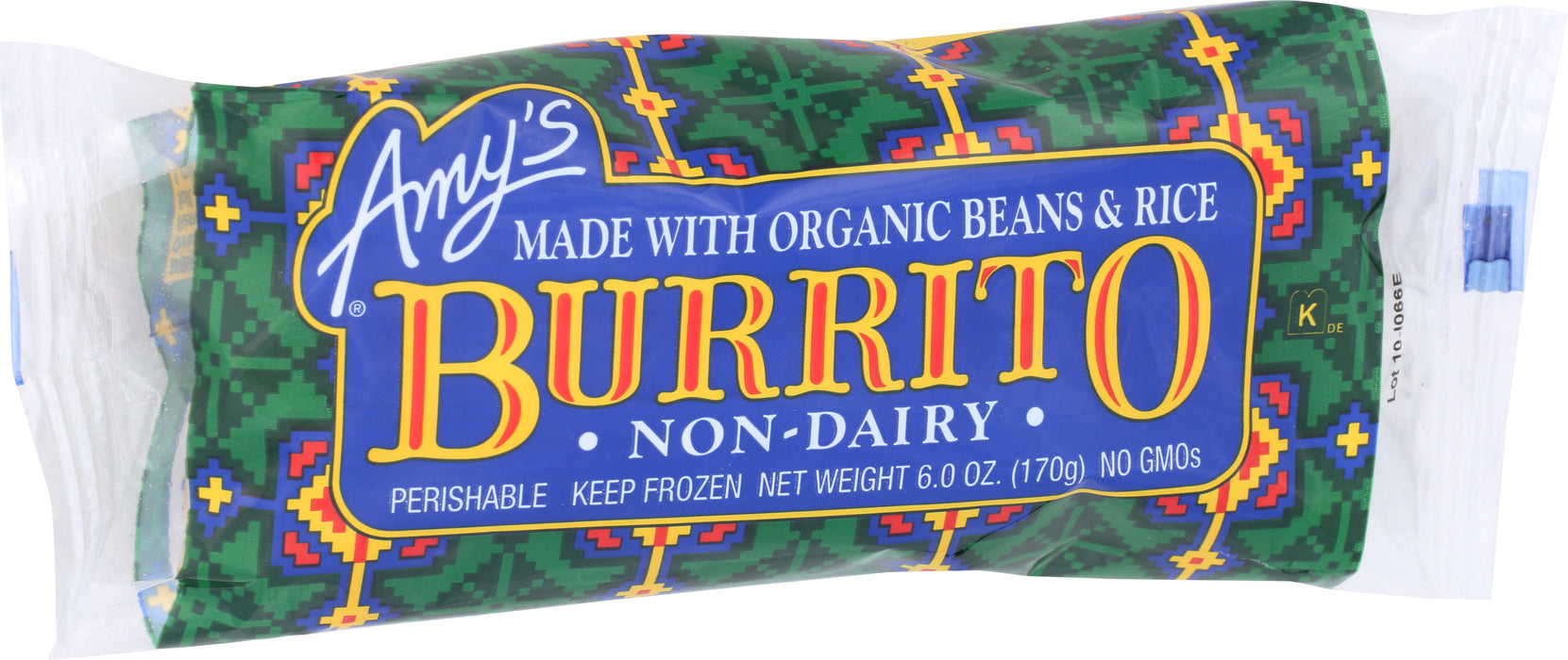 Amy's Frozen Bean & Rice Burrito, Vegan, Non-Dairy, the hearty duo of organic pinto beans and brown rice is mixed with tasty veggies in our mild Mexican-style sauce.