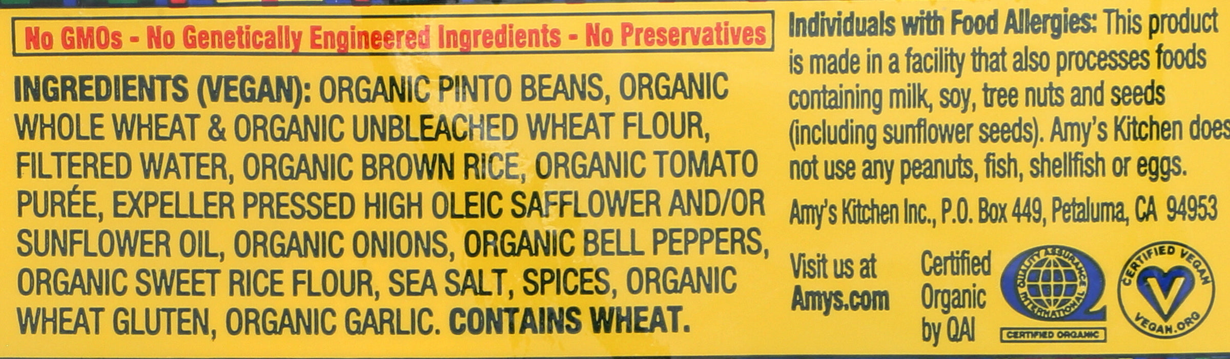 - One 6 oz Package of Amy’s Burrito, Non-Dairy.