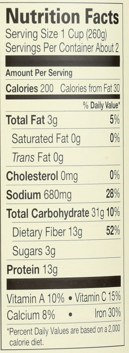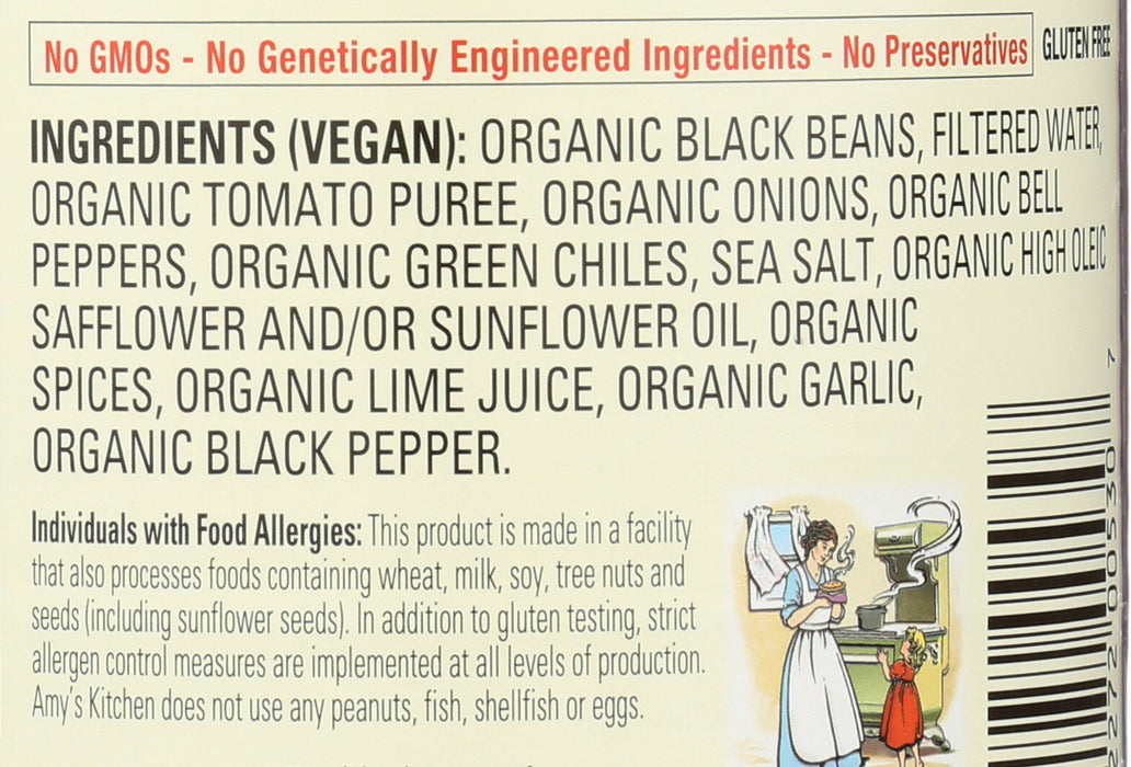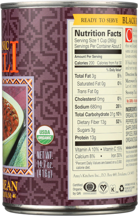 - Amy's organic Black Bean Chili, Low Fat, USDA organic