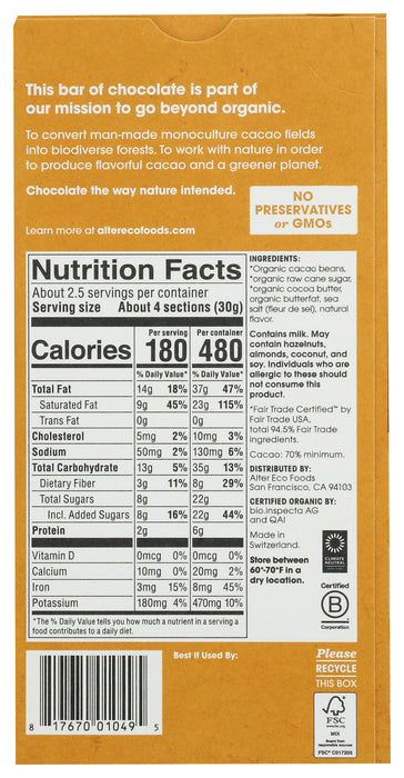 Alter Eco Organic Dark Chocolate Bar Brown Butter is ultra-silky finely crafted dark chocolate proves the saying that everything is better with butter. Heirloom cows contribute their lush grass-fed milk to be churned, browned, and stirred into the malty depths of our signature ecuadorian cacao. Our master chocolatiers complete the taste spectrum with a sprinkling of exquisite fleur de sel de guérande for a salty-sweet, luxuriously smooth bite.
