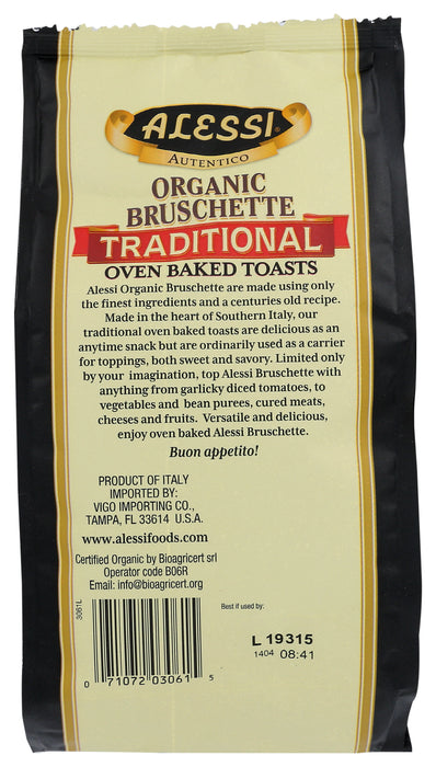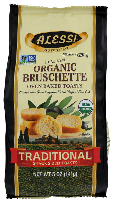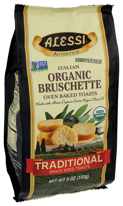 - Oven baked toasts alessi organic bruschette are made using only the finest ingredients and a centuries old recipe. Made in the heart of southern italy, our traditional oven baked toasts are delicious as an anytime snack but are ordinarily used as a carrier for toppings, both sweet and savory. Limited only by your imagination, top alessi bruschette with anything from garlicky diced tomatoes, to vegetables and bean purees, cured meats, cheeses and fruits. Versatile and delicious, enjoy oven baked alessi bruschette.