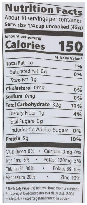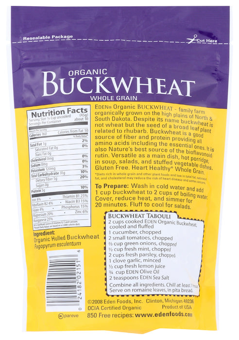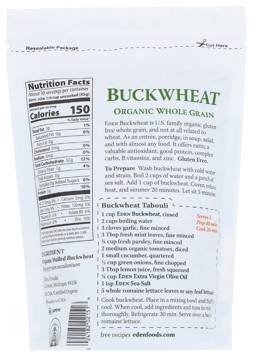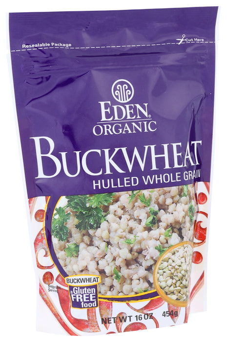 Eden Organic Whole Grain Buckwheat is not related to wheat and is gluten free. Hulled buckwheat groats are quick cooking whole grain, just 20 minutes. Mild, light, and energizing, high in thiamin B1, magnesium, and manganese, and a good source of protein, niacin, and zinc B3. Nature's best source of the important nutrient rutin. Enjoy it as an entree, as or in porridge, in soups, salads, stuffed cabbage, grain burgers, and more. 100% Whole grain. Packaged in a reclosable, protective, standing pouch.