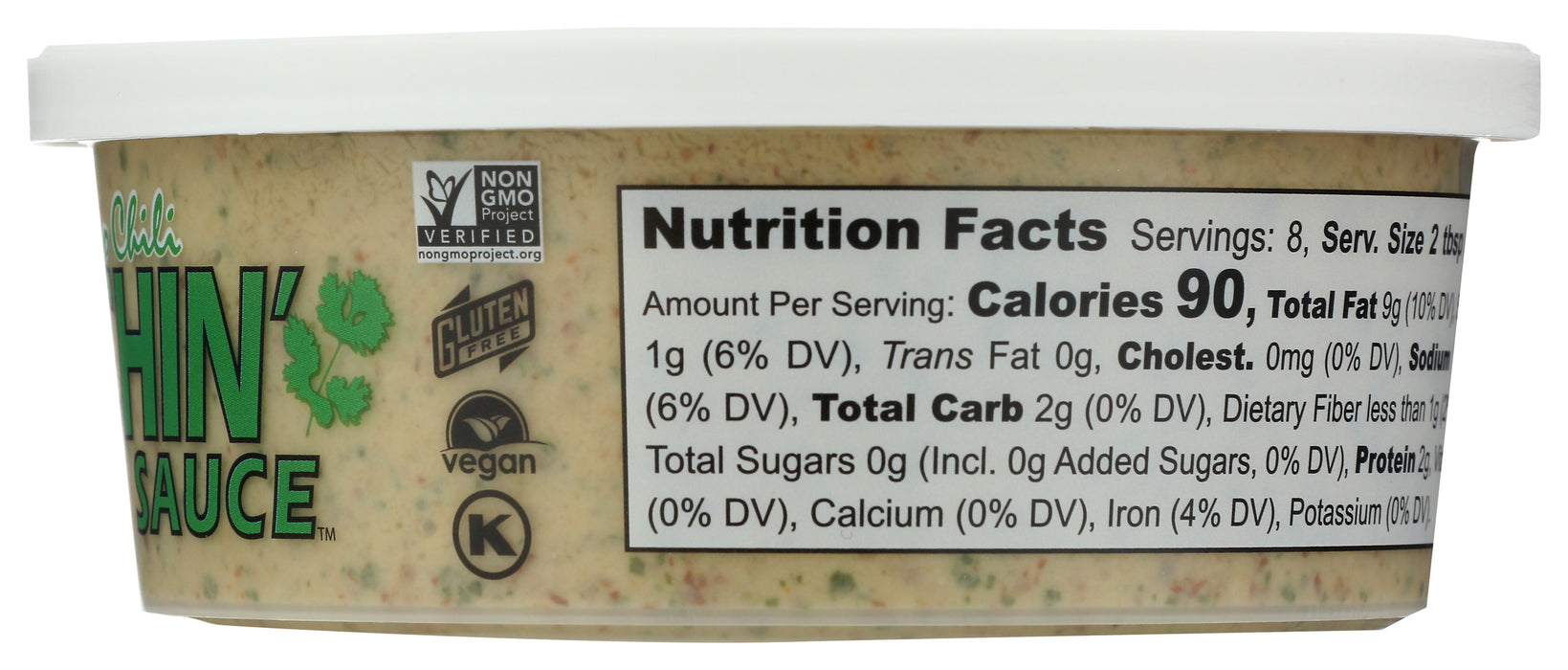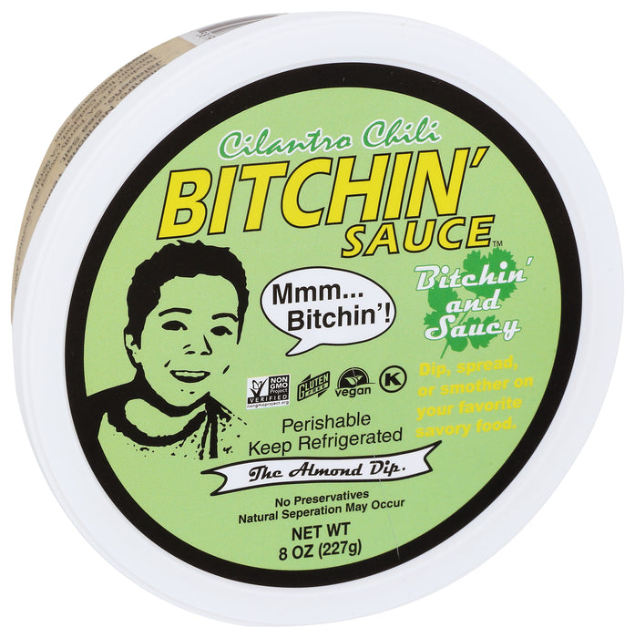Bitchin' Sauce Cilantro Chili flavor combines savory herbs and spices with citrus and nuts to deliver heat and a creamy texture to your favorite foods. almonds form the basis for this sauce, while lemon juice, Cilantro and garlic round out a flavor palate that goes well with fish, meat and mexican cuisine. At 90 calories for each 2 tbsp. serving, you get a hearty sauce with a lot of taste.this 8 oz. container needs refrigeration to maintain freshness.