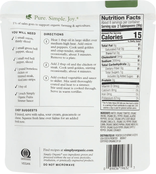 Simply Organic Classic Fajita Simmer Sauce has seasoning that's perfectly balanced with a pleasant chili heat that builds. Well-proportioned notes of chilies, bell peppers, onion, cumin and smoked paprika create a sauce that's equally delicious on beef or chicken. Includes one 8 oz. bag of Simply Organic Classic Fajita Simmer Sauce. We support and encourage the growth of organic farming practices and are committed to integrity in products and the way we do business. With Simply Organic you can feel good about the food on your table and its effect on the world we live in.