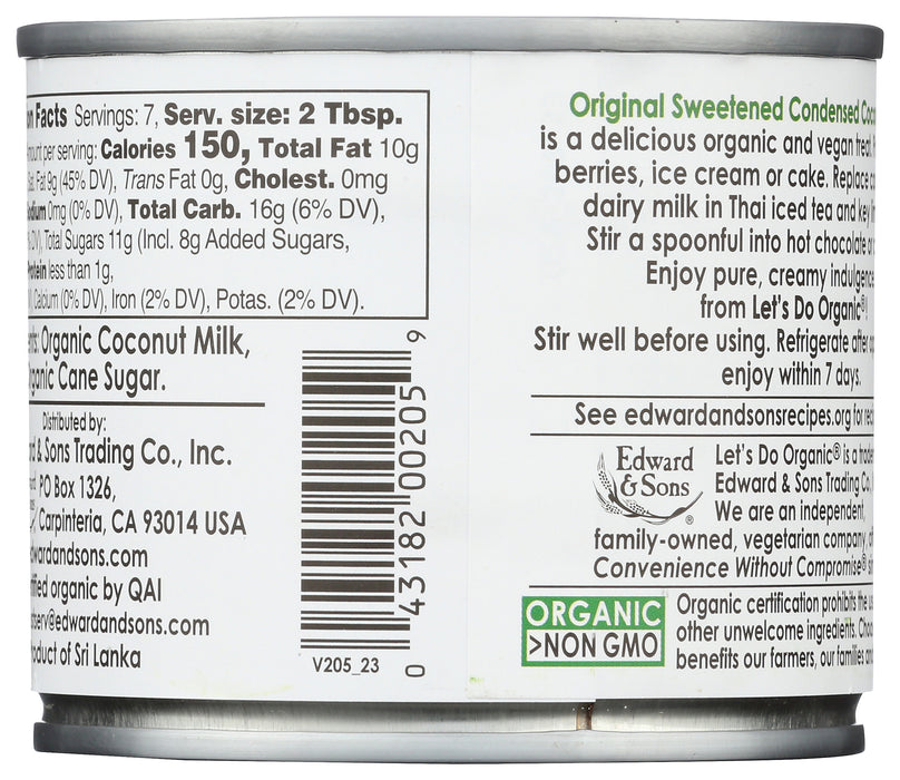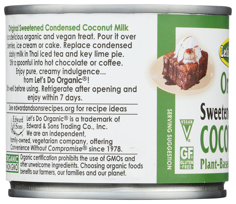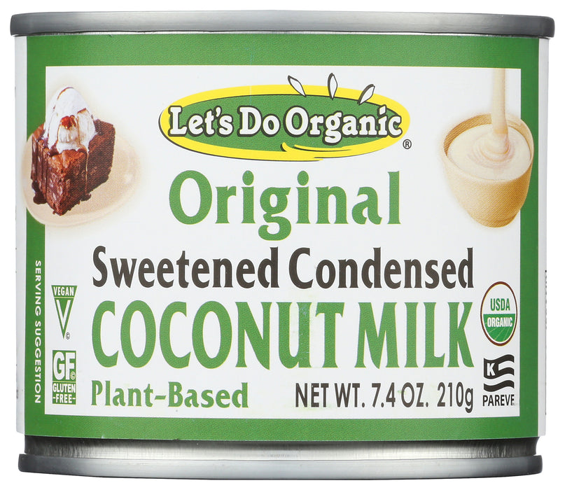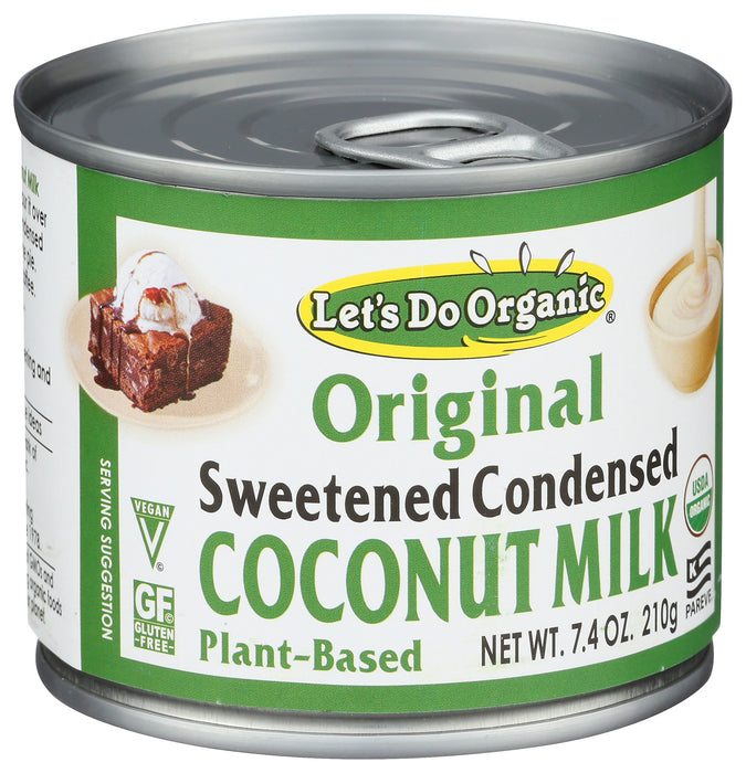 - Original Sweetened condensed Coconut Milk is a delicious organic and vegan treat. Pour it over berries, ice cream or cake. Replace condensed dairy milk in thai iced tea and key lime pie. Stir a spoonful into hot chocolate or coffee. Enjoy pure, creamy indulgence, From let's do organic.
