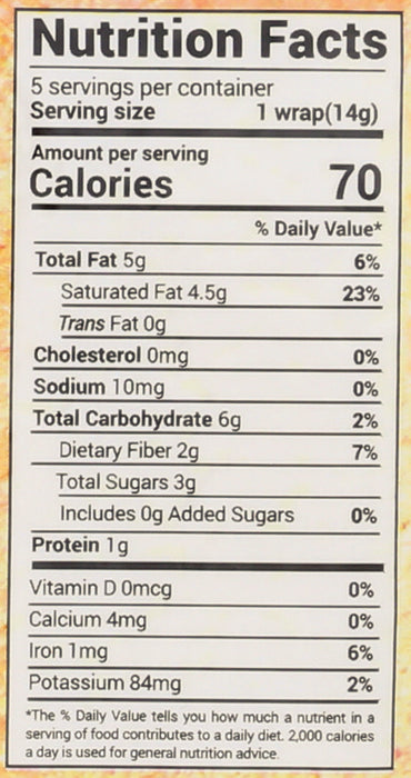 Nuco Organic Turmeric Coconut Wraps are a great way to enjoy burritos and rolls without consuming breads and tortillas. We make our wraps with coconut meat, coconut water and coconut oil. Our wraps contain no added salt and are suitable for anyone following a paleo diet. Each five-count pack has five servings that provide 70 calories each.