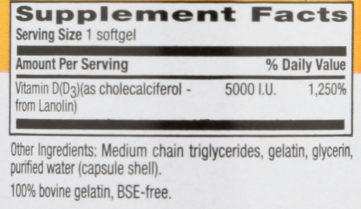 Country Life Vitamin D3 5000 IU Dietary Supplement contain a non-fish liver source of Vitamin D3 to help promote bone, dental and immune system health. Certified gluten-free, this supplement is also manufactured without yeast, corn, wheat, soy or milk for use by those with dietary restrictions. This 60 count bottle is recyclable to be an eco-conscious choice. *