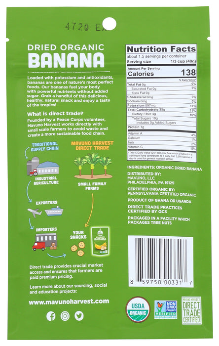 Mavuno Harvest's Organic Dried Banana is the perfect snack for anyone looking to fuel their body with natural, healthy ingredients. Our bananas are harvested at the peak of ripeness, then carefully dried to preserve their natural sweetness and nutrients. Mavuno Harvest Organic Dried Banana is also a great choice for those following a vegan or gluten-free diet. It's a natural, plant-based snack that is free from any animal products or gluten.
