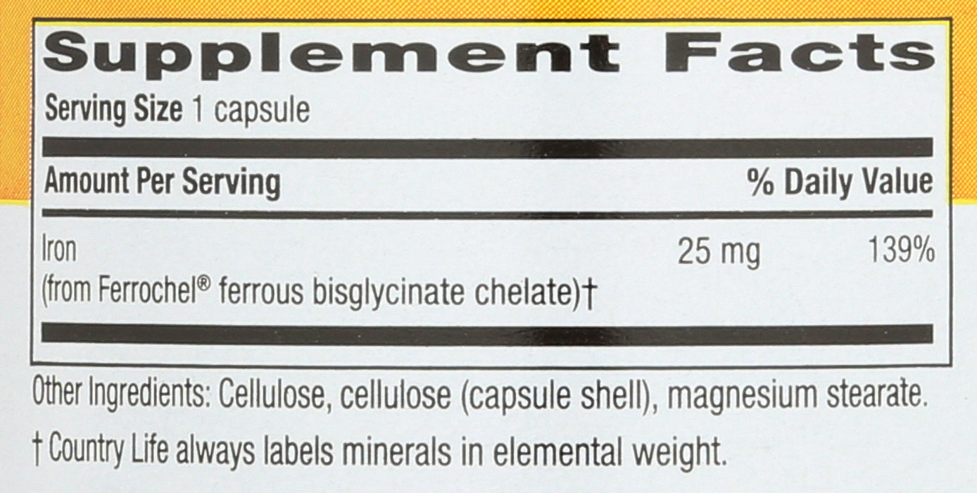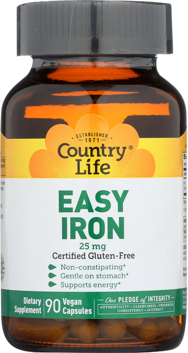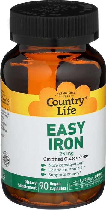 Country Life Easy Iron Dietary Supplement contains 25 mg of iron per serving to provide promote healthy red blood cell formation. This supplement contains ferrochel iron, which is gentle on your stomach and non-constipating. The capsules are gluten-free, vegan and kosher. The bottle contains 90 capsules of country life easy iron dietary supplement. *
