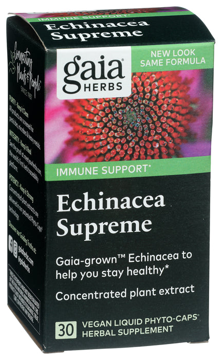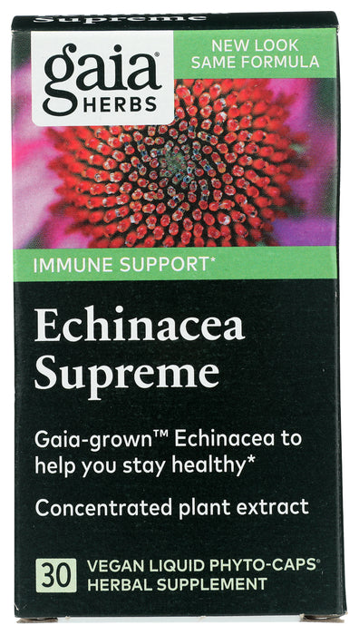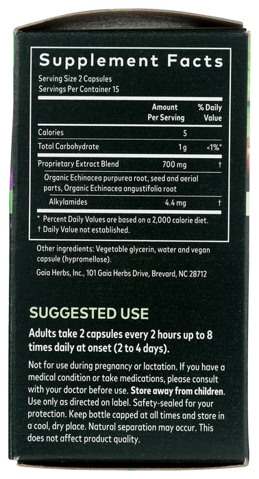 Gaia Herbs Rapid Relief Echinacea Supreme Dietary Supplement is formulated with a proprietary blend of echinacea purpurea and echincea angustifolia extracts to promote a fast-acting immune response. Each serving supplies 4.4 mg of powerful phytochemical isobutylamides found naturally in echinacea plants. Our formula is free of dairy and gluten, and we used alcohol-free phyto-caps capsules that are designed for easy digestion. This bottle contains 30 capsules.