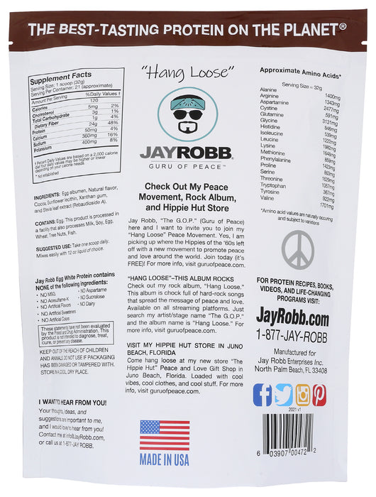 Jay Robb Chocolate Egg White Protein Dietary Supplement is formulated from the pure Egg albumen of chickens not treated with growth hormones. Flash pasteurized for safety, this supplement boasts 24 g of protein per serving and is fat-free. Try this delicious stevia-sweetened powder in milk, yogurt or smoothies for a quick and tasty protein boost. This container provides 24 oz of Chocolate Protein powder. *