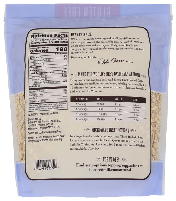 Bob's Red Mill Gluten Free Thick Rolled Oats are rolled extra thick for a robust texture and a nutty flavor. Use them to create a unique, european-style breakfast cereal topped with classic fixings like brown sugar, butter and milk pump up the nutrition of your porridge with ingredients like fresh fruit, nuts and seeds or try savory oatmeal with a spoonful of peanut butter and a swirl of sriracha hot sauce