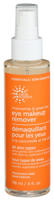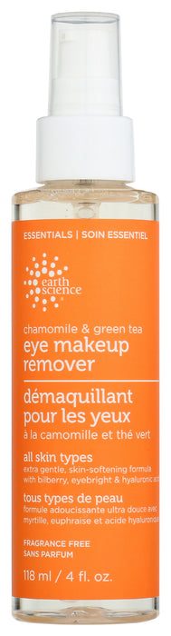 Earth Science Eye Makeup Remover Chamomile & Green Tea is a extra gentle, skin softening formula with bilberry, eyebright and hyaluronic acid. Gently lift away makeup‚ dirt and oil with this effective herbal formula. Calming chamomile and green tea soothe without stripping plus added hyaluronic acid for moisture. No artificial colors oil-free.