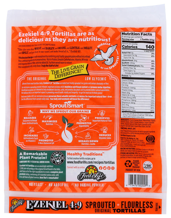 Food For Life Ezekiel 4:9 Sprouted Grain Tortillas releases enzymes to break down antinutrients maximizes nutrition increases antioxidants such as vitamin C promotes a more balanced PH promotes digestibility preserves important natural fiber reduces glycemic index breaks down starches + carbsInspired by the holy scripture verse take also unto thee wheat and barley and beans and lentils and millet and spelt and put them in one vessel and make bread of it.