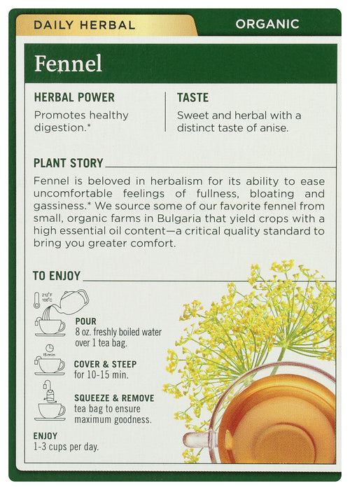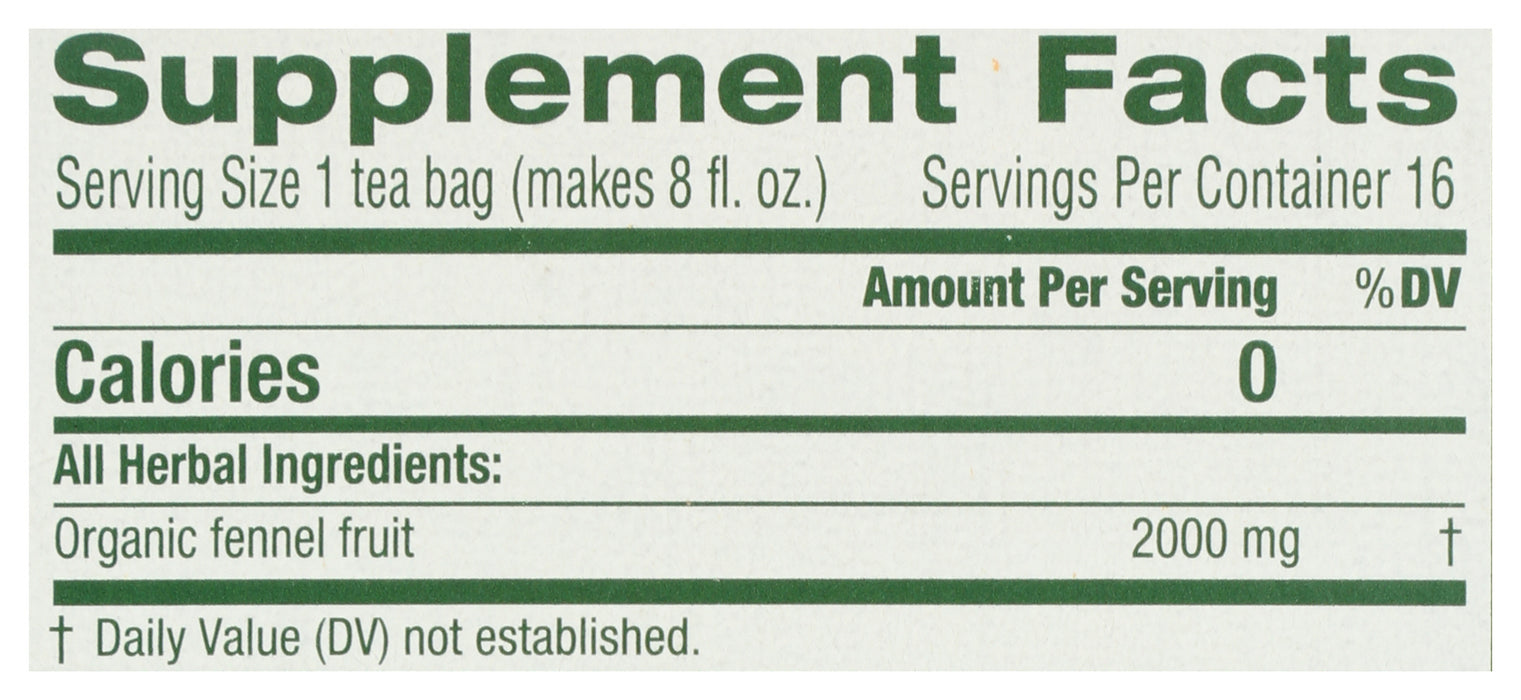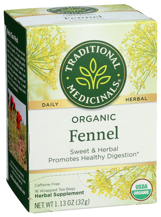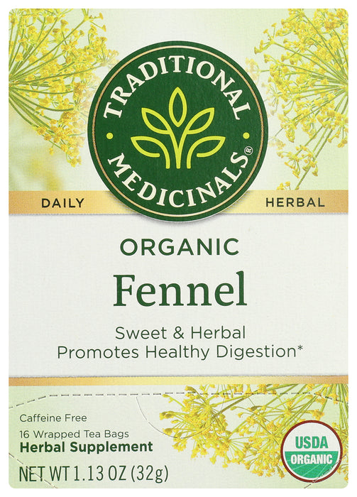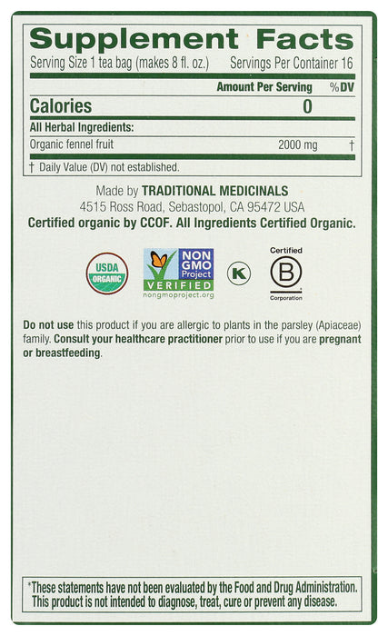 Traditional Medicinals Fennel Bagged Tea is made with certified usda organic and verified non-GMO ingredients. Each box contains 16 tea bags of our naturally caffeine free herbal tea. The primary ingredient, fennel fruit, supports healthy digestion and eases digestive discomfort.